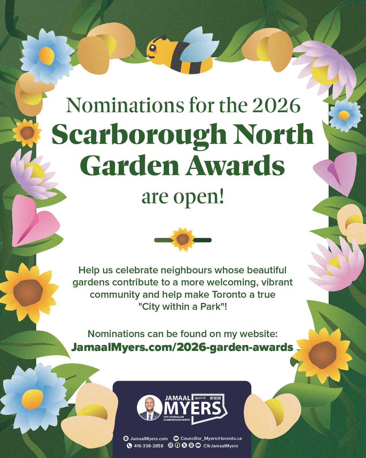 Scarborough North is full of passionate gardeners whose hard work brings beauty and pride to our neighbourhoods. As I visit different parts of the ward, I'll be surprising residents with Garden Awards to celebrate the gardens that brighten our streets. Know a garden that deserves recognition? Whether it's your own or a neighbour's, I'd love to hear about it. Contact my office if you need help submitting a nomination.