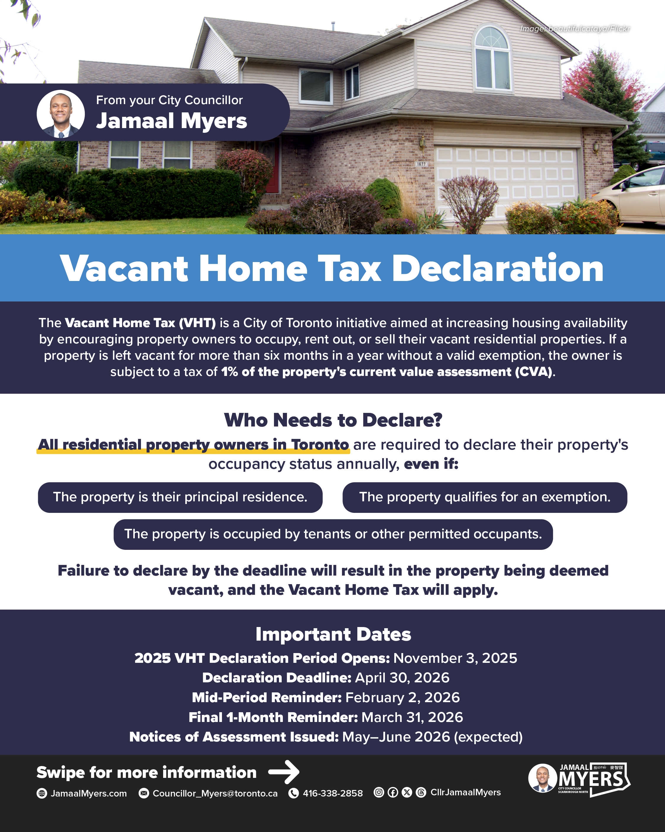 A friendly reminder that all residential property owners must submit their 2025 Vacant Home Tax declaration by April 30, 2026 — even if your home is your principal residence. Declarations can be completed online through the City's portal or in person at Scarborough Civic Centre or City Hall. If you have questions or need assistance, please contact 311 or my office.